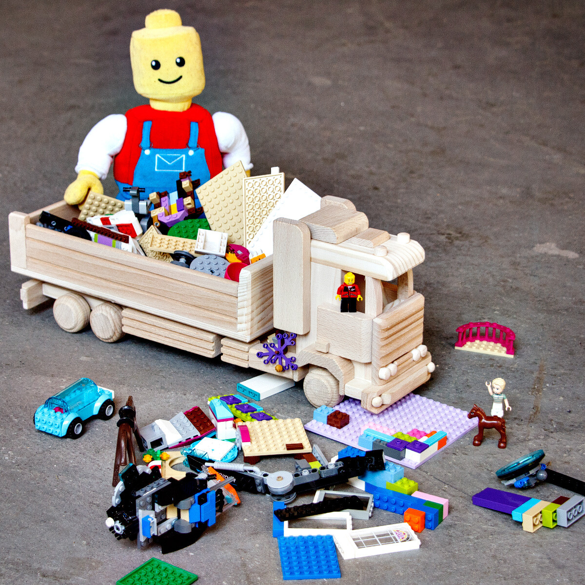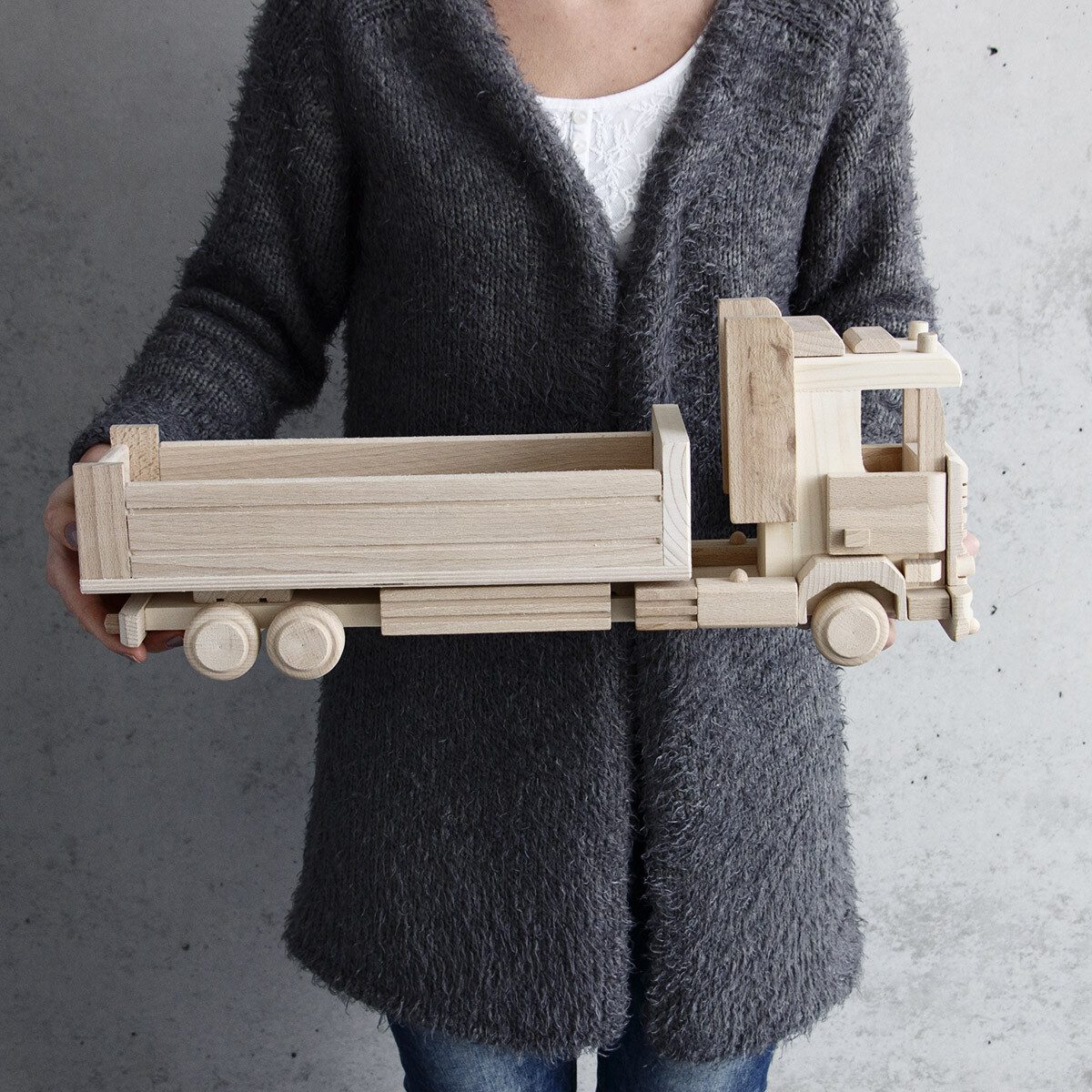 Bei der Produktion von diesem fast 50 cm langem, aus Vollholz gefertigten, Laster werden keine Schrauben, Nägel oder Klammern mit spitzen Enden verwendet.