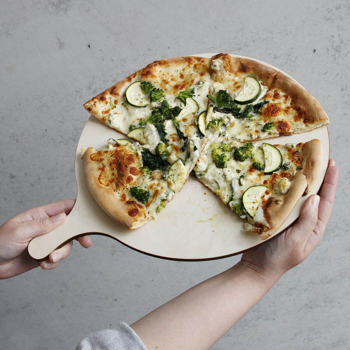 Aus einem Stück gefertigte Pizzaschaufel aus Holz. Zum Entnehmen und Servieren geeignet. Holz hält die Temperatur in der Pizza. Direkt vom Ofen auf den Tisch. Auch der Zuschnitt ist kein Problem.
