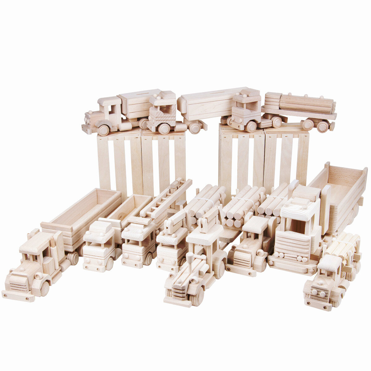 Große Holzspielzeugautos im LKW und Lastwagen Stil, die in vielen Details brilliert und natürlich über sich bewegende Räder verfügt, damit das Spielen so richtig Spaß machen kann.