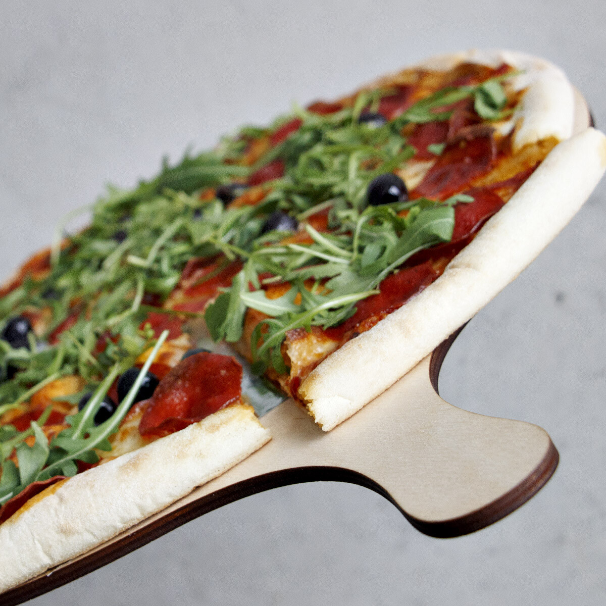 Aus einem Stück gefertigte Pizzaschaufel aus Holz. Zum Entnehmen und Servieren geeignet. Holz hält die Temperatur in der Pizza. Direkt vom Ofen auf den Tisch. Auch der Zuschnitt ist kein Problam.