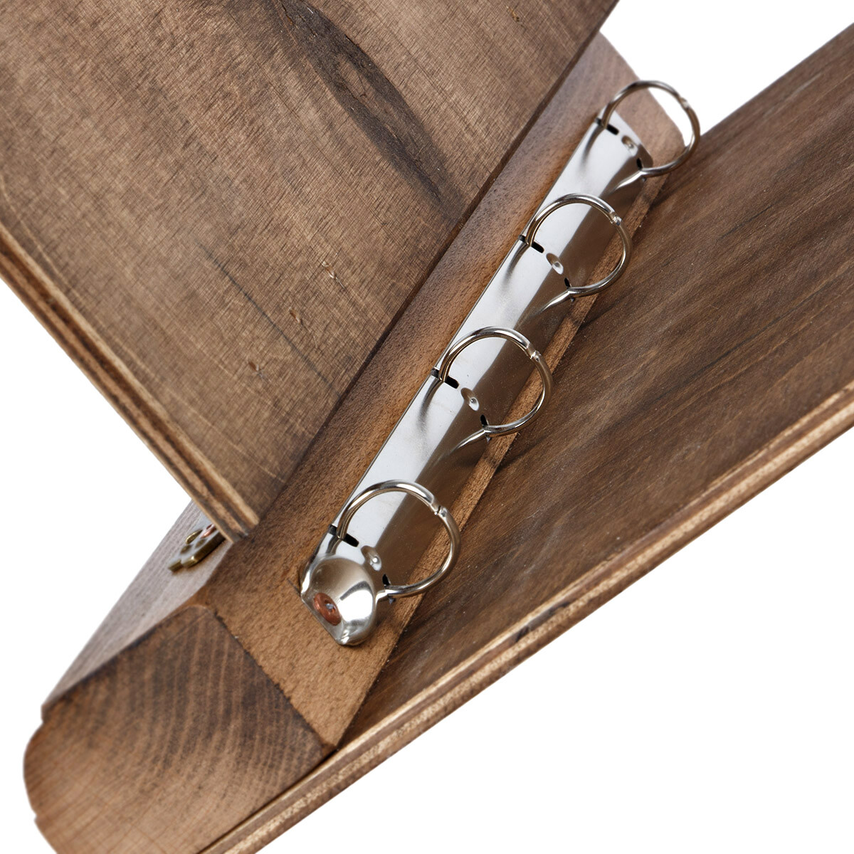 Die 4er Edelstahl Ringmechanik, die ein schnelles Öffnen und leichtes Austauschen der Dokumente ermöglicht, ist auf das Holz angenietet.