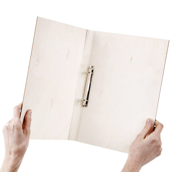 Der Schnellhefter aus solidem Holz wurde dank neuster Technologien so bearbeitet, dass aus starrem Holz ein biegsamer Ordnerrücken wurde, der sich umblättern lässt wie Papier.